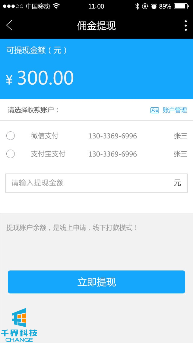 管理員通過(guò)后臺可以把關(guān)注的用戶(hù)設置為代理商,也可以把代理商設置為普通用戶(hù),距離下次繳服務(wù)費天數,賬單,余額明細,安裝明細,我的錢(qián)包,提現,銀行賬戶(hù)管理,二維碼識別或者轉發(fā)