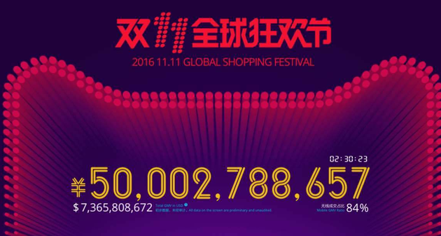 2016天貓雙11全球狂歡節開(kāi)場(chǎng)14分16秒,總成交超191億人民幣,已超2012年雙11全天的成交額,01:00:57,2016天貓雙11全球狂歡節交易額超362億元,超過(guò)2013年雙11,無(wú)線(xiàn)交易額占比84.3%。